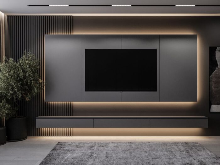 - Dramatic Color Palette: The rich charcoal or dark gray tones provide a bold, dramatic backdrop that makes your TV screen and other elements stand out.