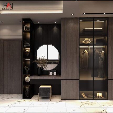 - Custom Mirror Components: Full-length mirror panels with custom framing and dedicated wiring channels for backlighting.