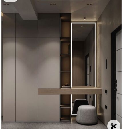 - Central Mirror Feature: The end of the closet corridor features a full-length mirror framed by vertical LED strips, transforming the end wall into a functional and dramatic focal point.